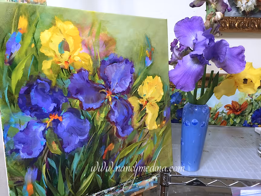 After a rainy day left her iris garden drooping, Nancy gathered fallen yellow blooms for a studio session—accompanied by her four delightful pug assistants. Each pup brought their own quirky charm to the garden adventure, adding joy and mischief to a wet spring day before the artist heads off to teach in New Orleans.