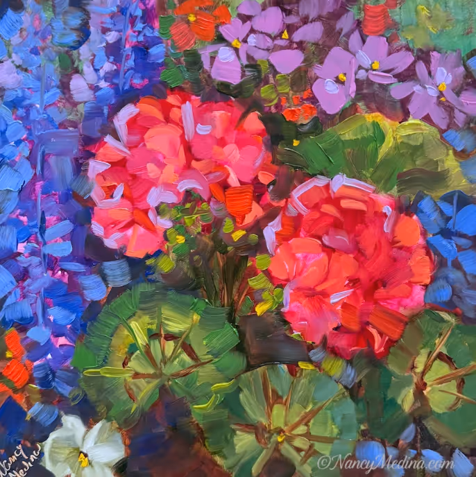 Playful Peach Geraniums practically painted themselves with joy. These blooms are soft but spirited, a cheerful tangle of coral, pink, and orange that feels like a garden party in full swing. I nestled them in deep greens and cobalt shadows to give them room to glow, letting their petals bounce and sway like laughter on a warm day. The brushwork is loose, painterly, and full of movement—just the way I love to paint when I let go and trust my instincts. This piece is about finding beauty in play, delight in the unexpected, and color in every corner of life. *All painting sales are final